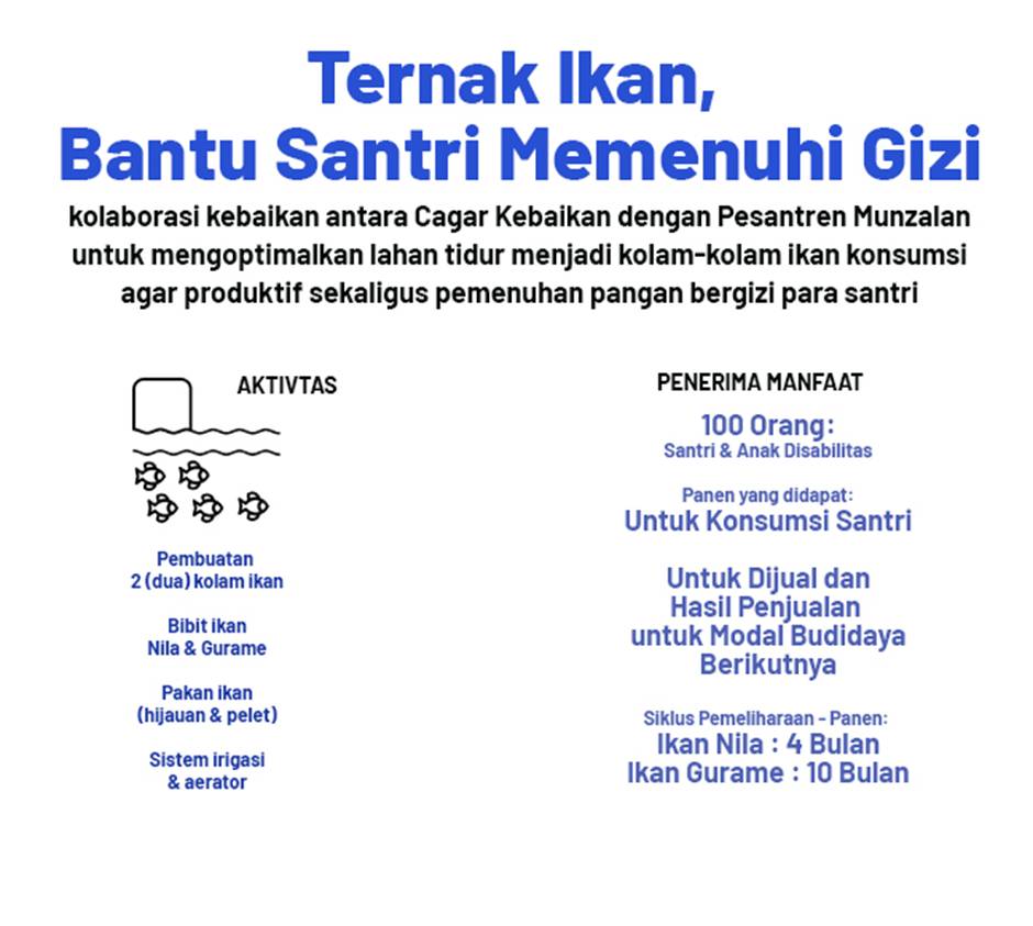 Program ini dirancang agar para santri tidak hanya mendapatkan asupan gizi yang cukup, tetapi juga belajar beternak ikan sebagai keterampilan mandiri yang bernilai.